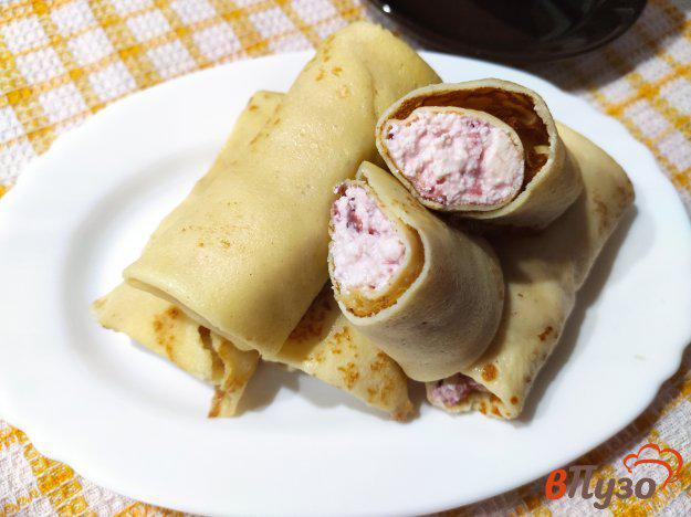 Разогрейте сковороду, смажьте ее маслом. Вылейте небольшое количество теста и равномерно распределите по сковороде. Жарьте блины с обеих сторон до золотистого цвета. Готовые блины можно разложить на тарелку, намазать творогом и добавить варенье. Сверните их в трубочку или треугольник и подавайте горячими. При желании можно посыпать блины сахаром или посыпать медом.